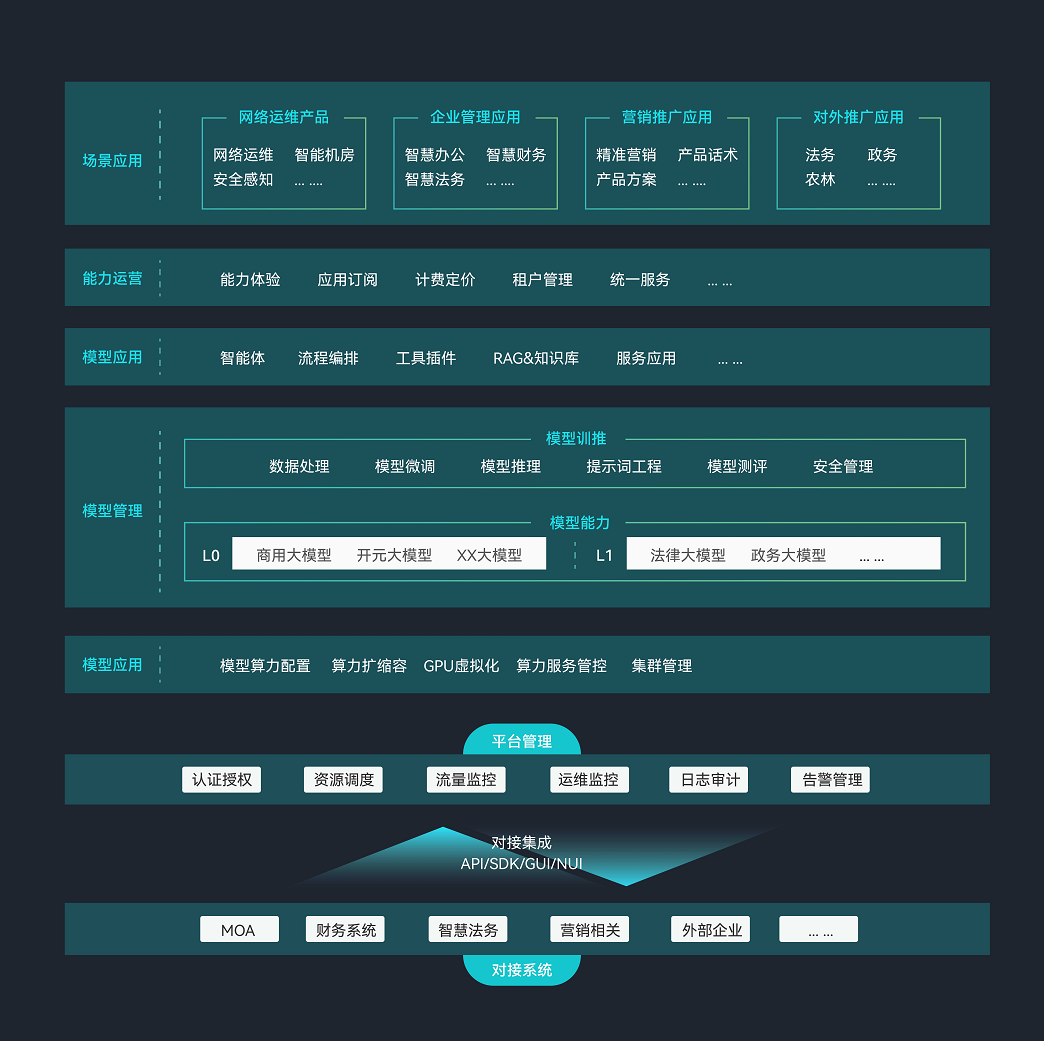 AlphaMind? 大模型管理平台(MaaS)具备数据管理、微调训练、推理部署、应用开发、能力服务等功能,基于多种开源或 闭源大模型及Agent、RAG框架进行场景化的应用开发、部署和运营管理,从而支撑需求场景,实现对内赋能,对外变现。